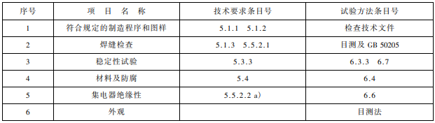 6 1 焊縫檢驗采用目測法 6 2 環(huán)境適應(yīng)性檢測 6 2 1 溫度用 0 ~ 100 ℃溫度計測定。 6 2 2 pH 值測定按 GB / T 6920 進行。 6 3 性能試驗 6 3 1 運行速度用秒表和鋼尺測量、計算求得。 6 3 2 可靠性、耐久性試驗 空載試驗不少于 8 h;負荷試驗不少于 72 h。正常運行平均無故障工作時間和使用壽命根據(jù)用戶 調(diào)查確定。 6 3 3 穩(wěn)定性試驗 出廠檢驗時其傳動部分在制造廠內(nèi)組裝后進行,型式檢驗應(yīng)在負荷試驗或正常運行時進行。 a)用鉗形表測量工作電流; b)各部位溫升應(yīng)在開機 2 h 后用溫度計測量。 c)噪聲測量按 GB / T 3768 進行。 6 4 涂裝質(zhì)量檢驗 a)漆膜厚度使用電磁式漆膜測厚儀測量; b)外觀用目測法檢驗; c)漆膜附著力按 GB / T 1720 的規(guī)定進行檢驗; d)如表面進行熱噴涂應(yīng)按 GB / T 9793 進行檢測。 6 5 主梁的撓度測量,應(yīng)在安裝以后進行,用鋼絲和直尺測得。 6 6 絕緣電阻采用兆歐表測量。 6 7 過力矩保護裝置的可靠性用力矩試驗機測量。 6 8 集電器耐壓試驗,在 2 000 V 試驗電壓的條件下做耐壓試驗 1 min,無擊穿現(xiàn)象。 6 9 中心回轉(zhuǎn)支承中滾道和鋼球硬度根據(jù) JB / T 2300 的檢測方法,用硬度計測量。