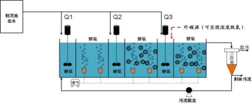 以三段 A/O 進(jìn)水方案為例,工藝流程為:由 3 段缺氧/好氧順序排列組成, 其中好氧第二段和第三段均投加 20%—30%的懸浮生物填料。原水分三段進(jìn)入 各缺氧區(qū), Q1:Q2:Q3 為 40%:30%:30%(流量分配比可根據(jù)水質(zhì)水量進(jìn)行優(yōu) 化調(diào)節(jié)),回流污泥回流到系統(tǒng)的首端。第一段的缺氧區(qū)利用進(jìn)入該區(qū)污水 Q1 中的碳源對(duì)回流污泥中的 NOx-N 進(jìn)行反硝化,然后,混合液流入第一段的好氧 區(qū)進(jìn)行硝化反應(yīng);反應(yīng)后的混合污水流入到第二段的缺氧區(qū),利用進(jìn)入該區(qū)污 水 Q2 中的碳源進(jìn)行反硝化,混合液再進(jìn)入到第三段的好氧區(qū)進(jìn)行硝化反應(yīng), 以后各段以此類推。