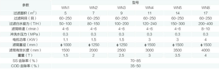 注:當(dāng)廢水濃度越高、網(wǎng)目越高,SS、COD 去除率越高。可根據(jù)用戶需求,定做處理量大的機型和不銹鋼材質(zhì)配件。