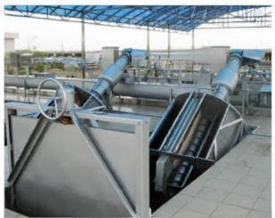 工作原理:轉鼓式格柵除污機與水平面呈35°安裝在水渠中,污水從鼓的端頭流入鼓中,水通過柵網(wǎng)的柵縫流出,固體垃圾被過濾在柵網(wǎng)筐內,帶有耙齒的清潔臂在圓周運動時清理格柵縫隙,耙齒伸入柵網(wǎng)中,將固體取出,當清潔臂處于最高點時,通過水的沖洗及擋渣板的作用,將垃圾從耙齒上清除下來,并掉入垃圾收集裝置螺旋輸送斗中,在輸送過程中通過變螺距的作用被脫水,在最上端壓縮區(qū)被擠干,而擠壓水被回流至水渠,垃圾最后送入集裝箱或后繼設備,再進行處理。