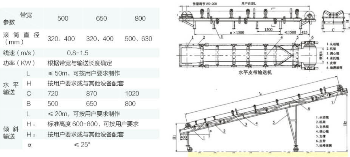 用途:帶式輸送機(jī)主要用來(lái)輸送顆?;蚍勰罟腆w,用于環(huán)保上主要用于輸送柵渣,脫水后的泥餅、泥沙等。